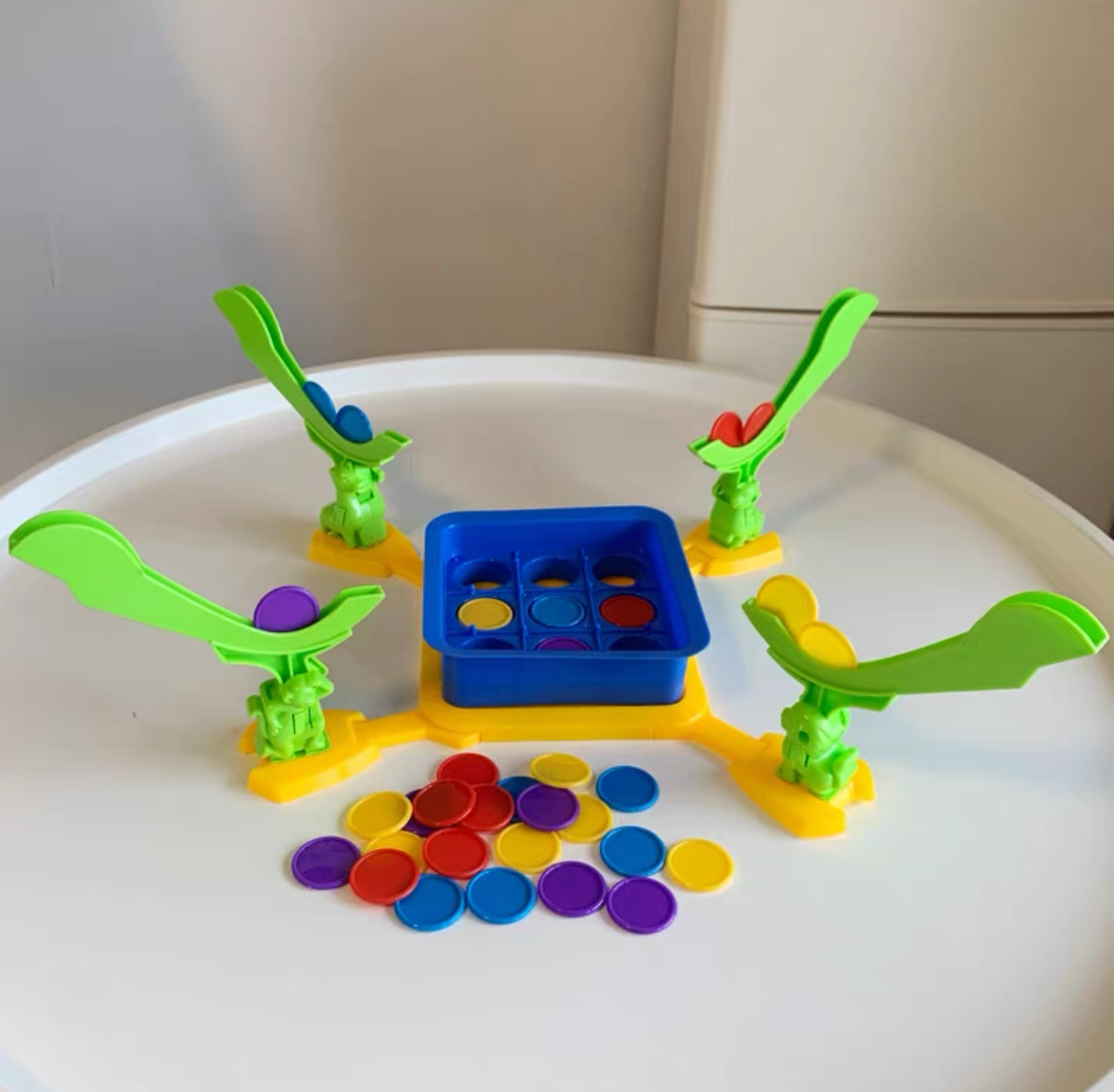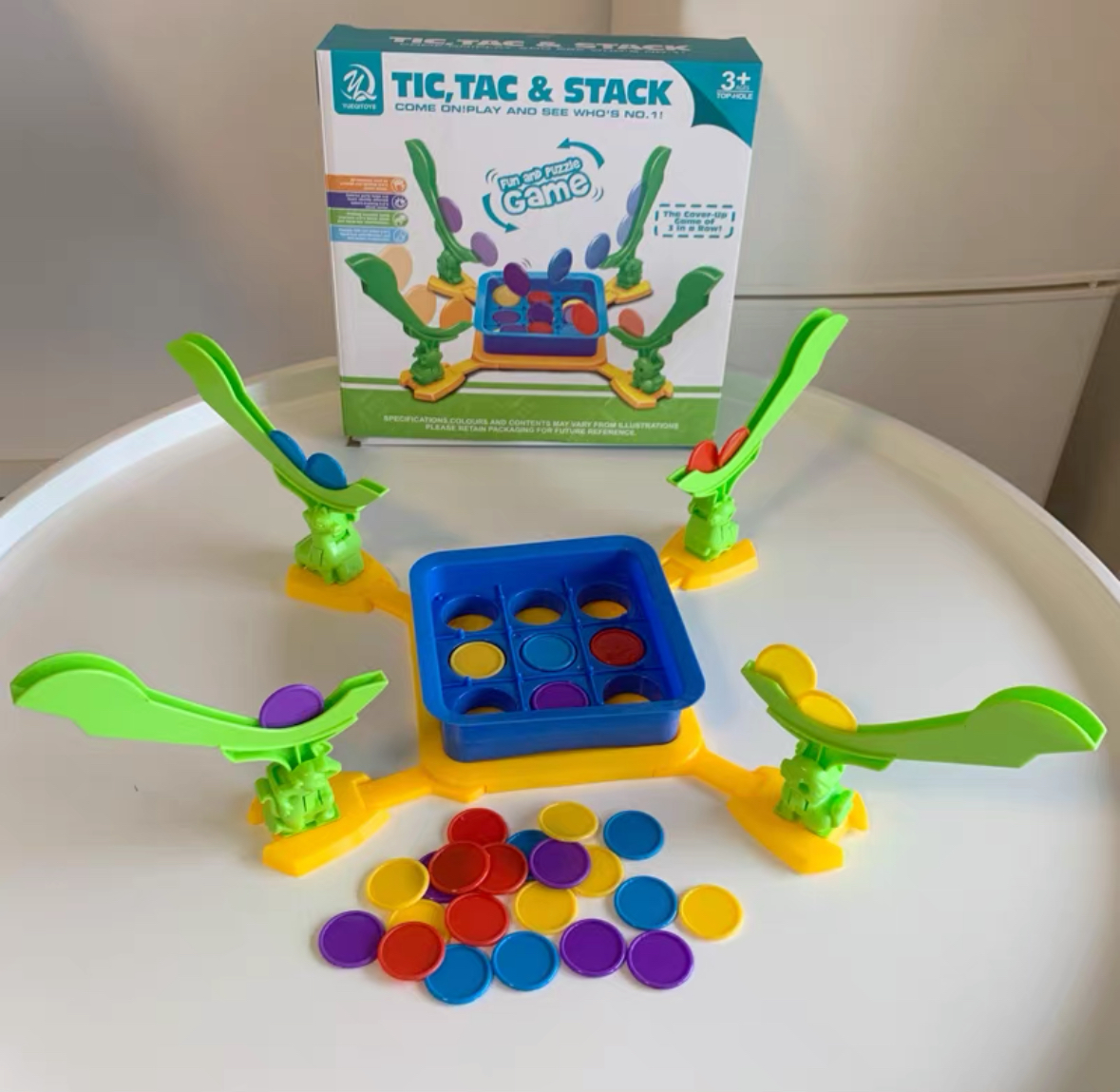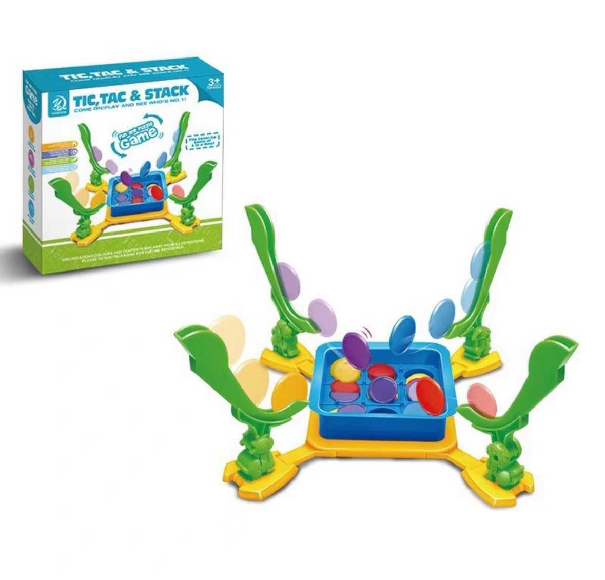 A creative twist on the classic Tic Tac Toe game where players use a flipping mechanism to launch colored discs into a grid.