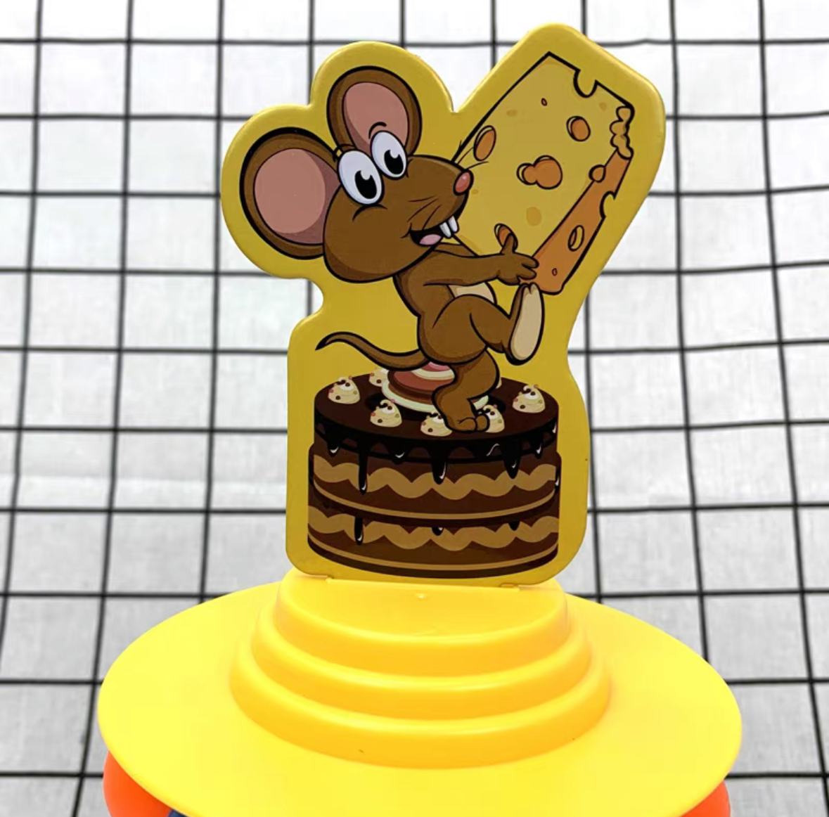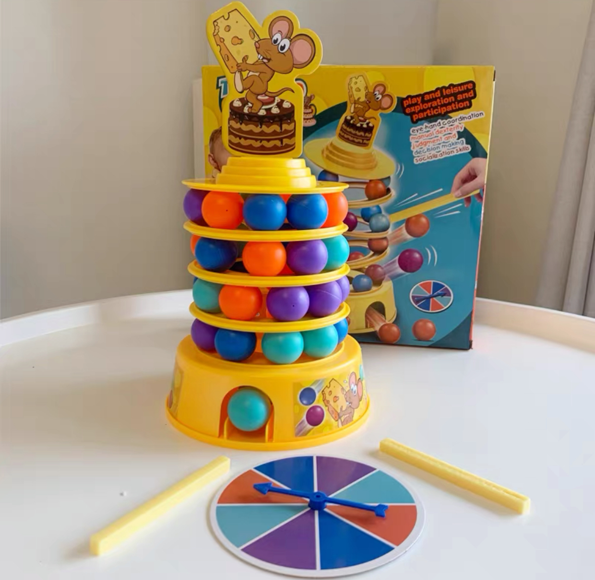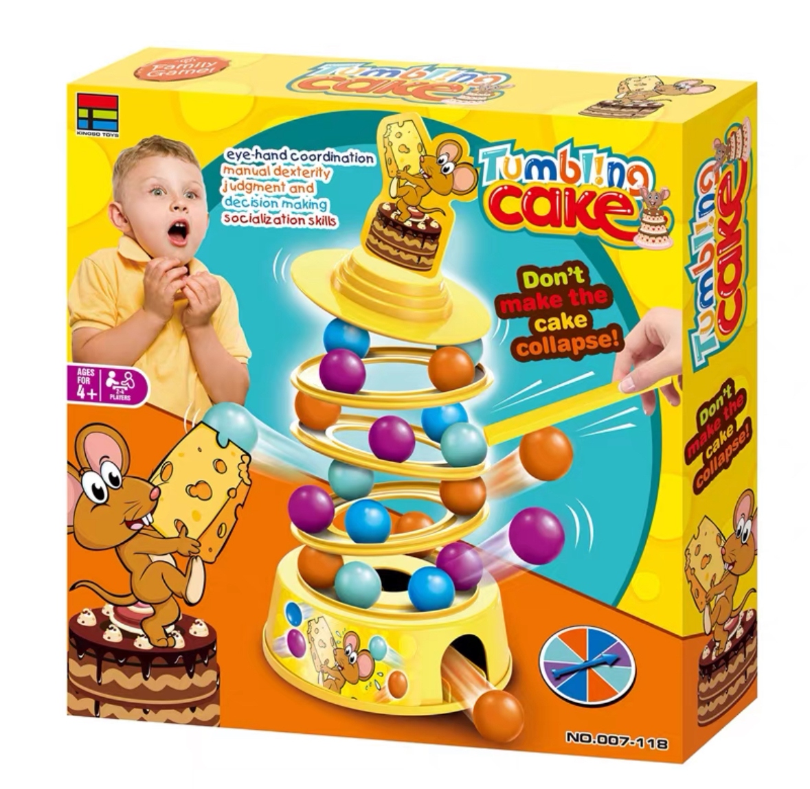 The Tumbling Cake Game is a fun, interactive balancing game designed for children aged 4 and above. It features a multi-layered cake-like structure with vibrant, colorful balls stacked on each layer. Players spin a wheel to determine their move and must carefully remove balls using tools like sticks, without causing the cake to collapse. A mischievous mouse figure decorates the top of the cake, adding a playful element to the game.