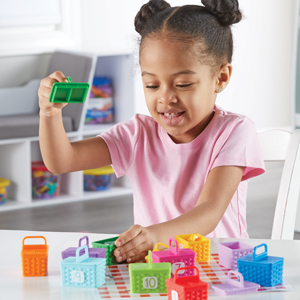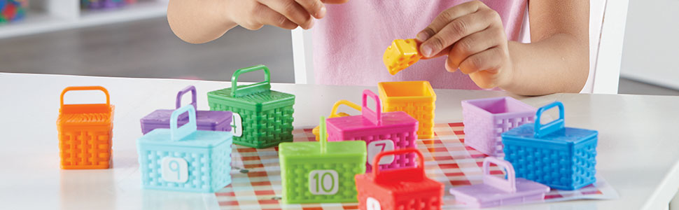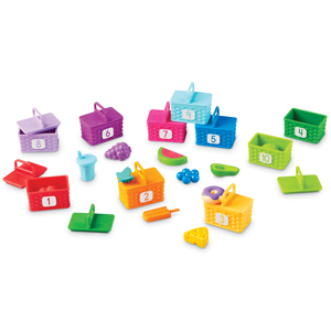 "This picnic is packed with counting and color surprises! Kids discover 10 colorful food surprises hidden within the 10 picnic baskets of the Sorting Surprise Picnic Baskets set from Learning Resources. Cast in a rainbow of 10 vibrant colors, these numbered picnic baskets hide 10 color-coded plastic counter manipulatives shaped like everything from avocado to a donut to a bunch of blueberries! There's even an extra butterfly that's ready for friendly games of memory and hide-and-seek! As they play with this learning toy, kids boost their preschool skills through the Sorting Surprise Picnic Baskets' 4-in-1 learning—work on counting and color skills, try sorting by attributes, or build fine motor skills! This set of Sorting Surprise Picnic Baskets comes with a full-color activity guide that doubles as a picnic blanket for imaginative afternoons spent feasting with stuffed animals or imaginary friends!