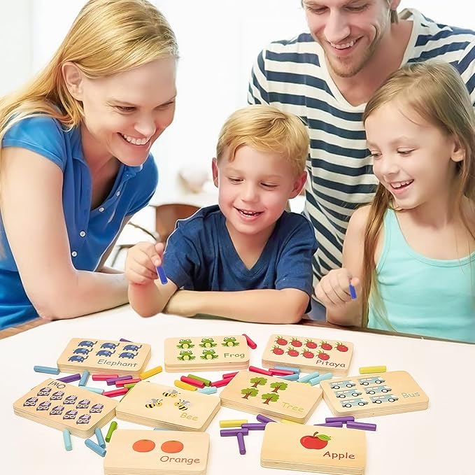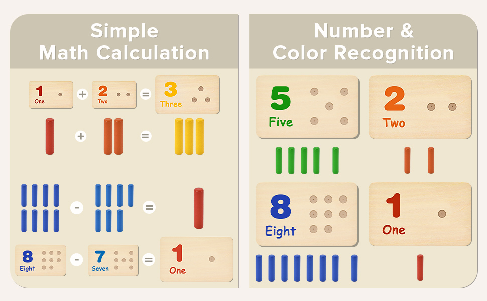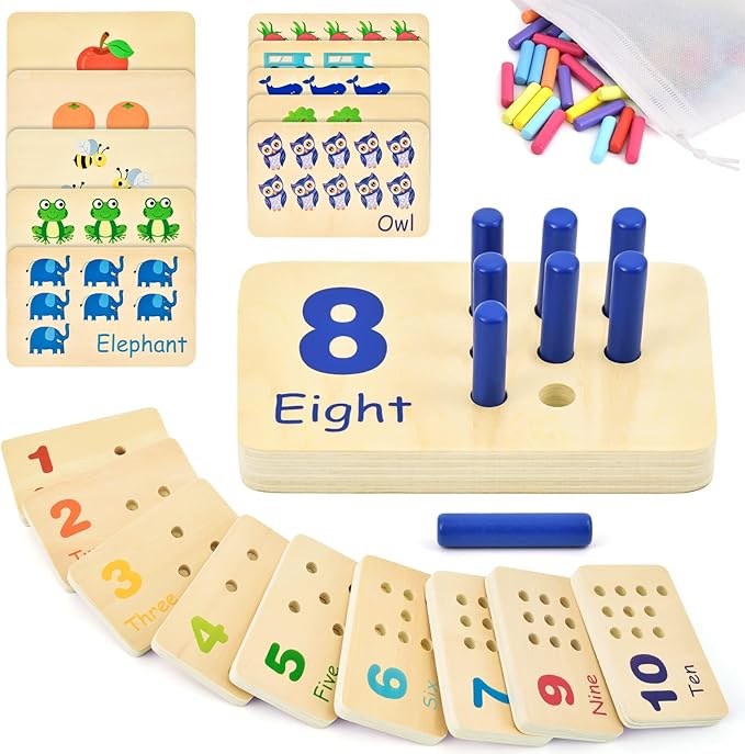 Multi-Ways Learning & Education: The front side of this board game can play the classical counting peg & color sorting game, and the back side is printed with the corresponding number of patterns, which can help children better review numbers. Brightly colored wooden educational toys can attract children's attention, through visual recognition and the use of wooden counting pegs
