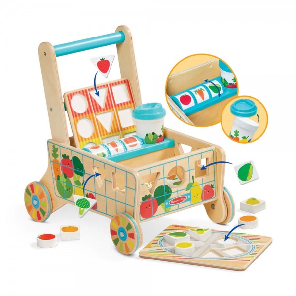 This cheery and sturdy wooden grocery cart is filled with fun skill-building activities!