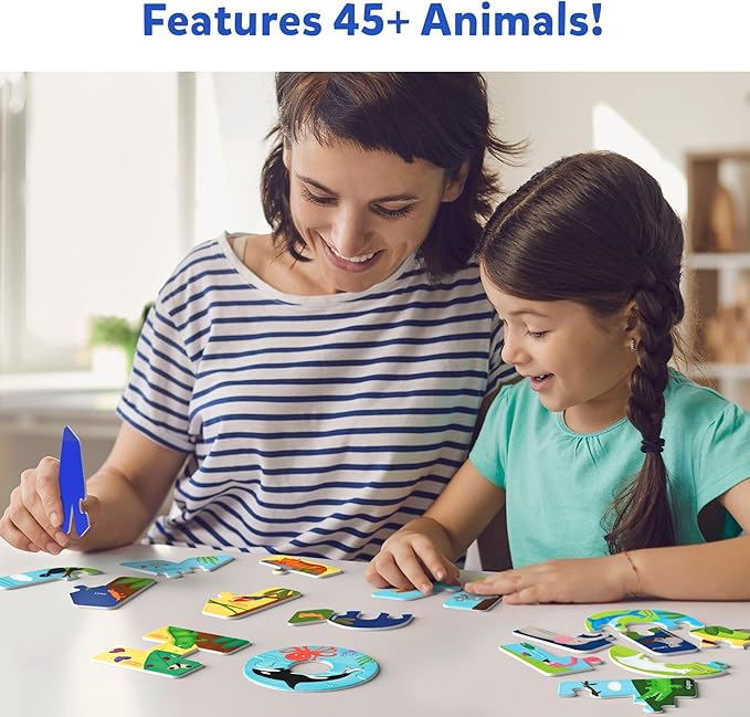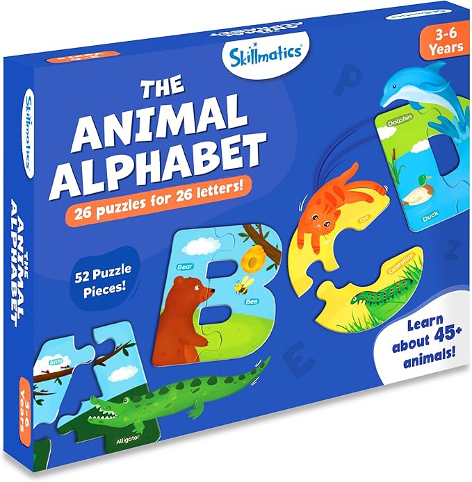26 MINI PUZZLES FOR PRESCHOOLERS: The Animal Alphabet puzzle set includes 52 extra-thick cardboard pieces that are easy for children to put together. Once the puzzles are completed, they display 26 colorful uppercase letters that feature over 45 animals!