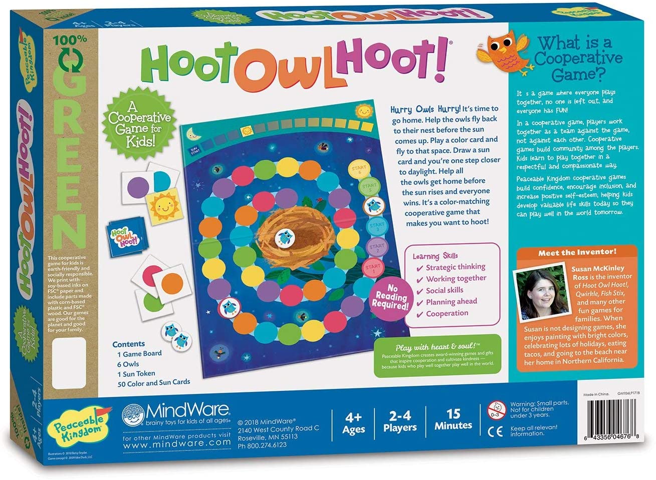 WHO CAN PLAY: 2-4 Players. Recommended for Ages 4-8. Game includes 1 game board, 6 owl tokens, 1 sun token, 14 sun cards, 36 color cards and instructions for two versions of game play
