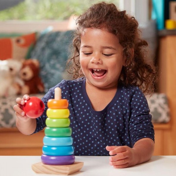 Includes eight smooth, easy-grasp wooden pieces to stack on the solid-wood, rocking base.