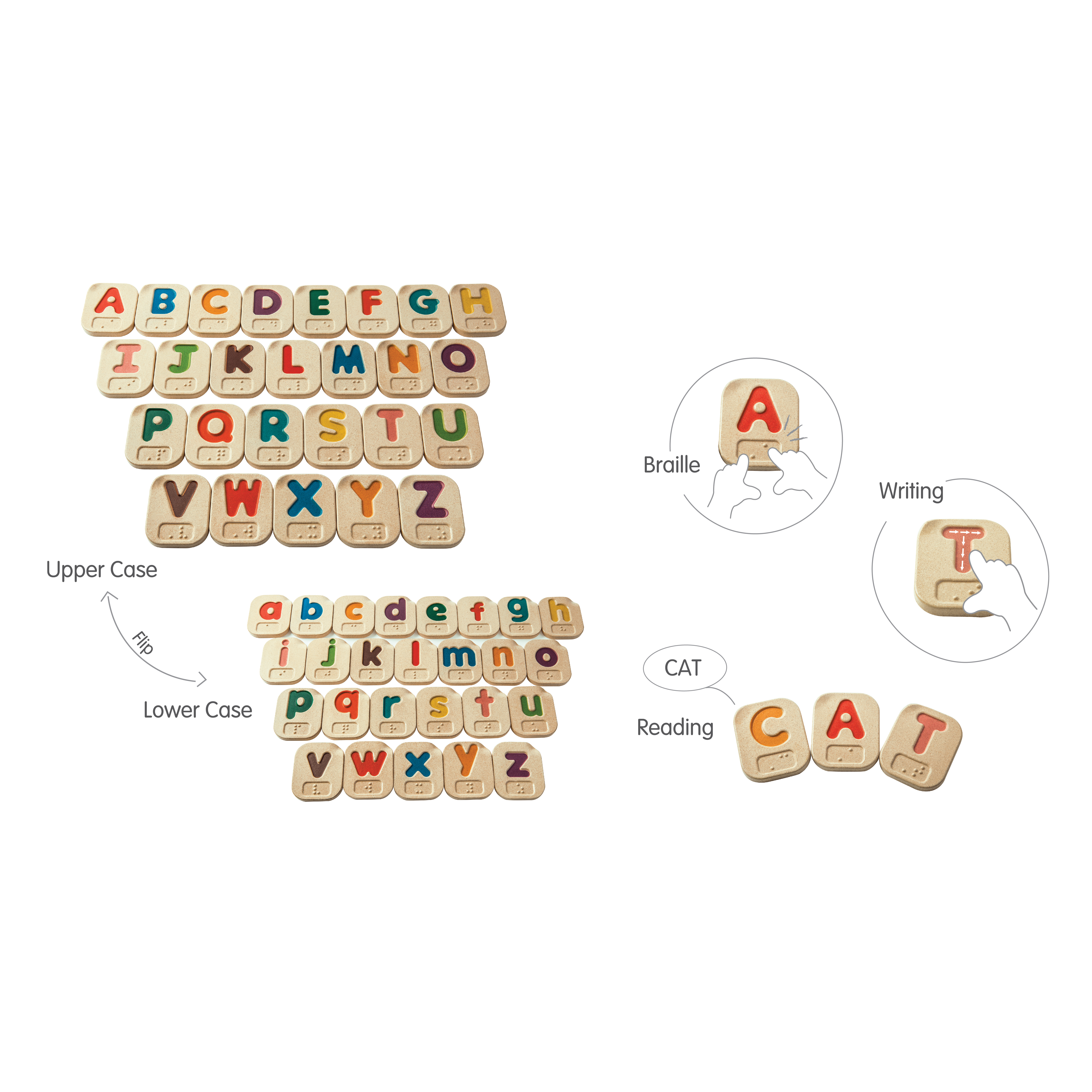 This 26 piece Braille Alphabet A-Z set can be played 2-sided, one upper case and another lower case. Each tile has a Braille symbol that represents each letter in the alphabet.