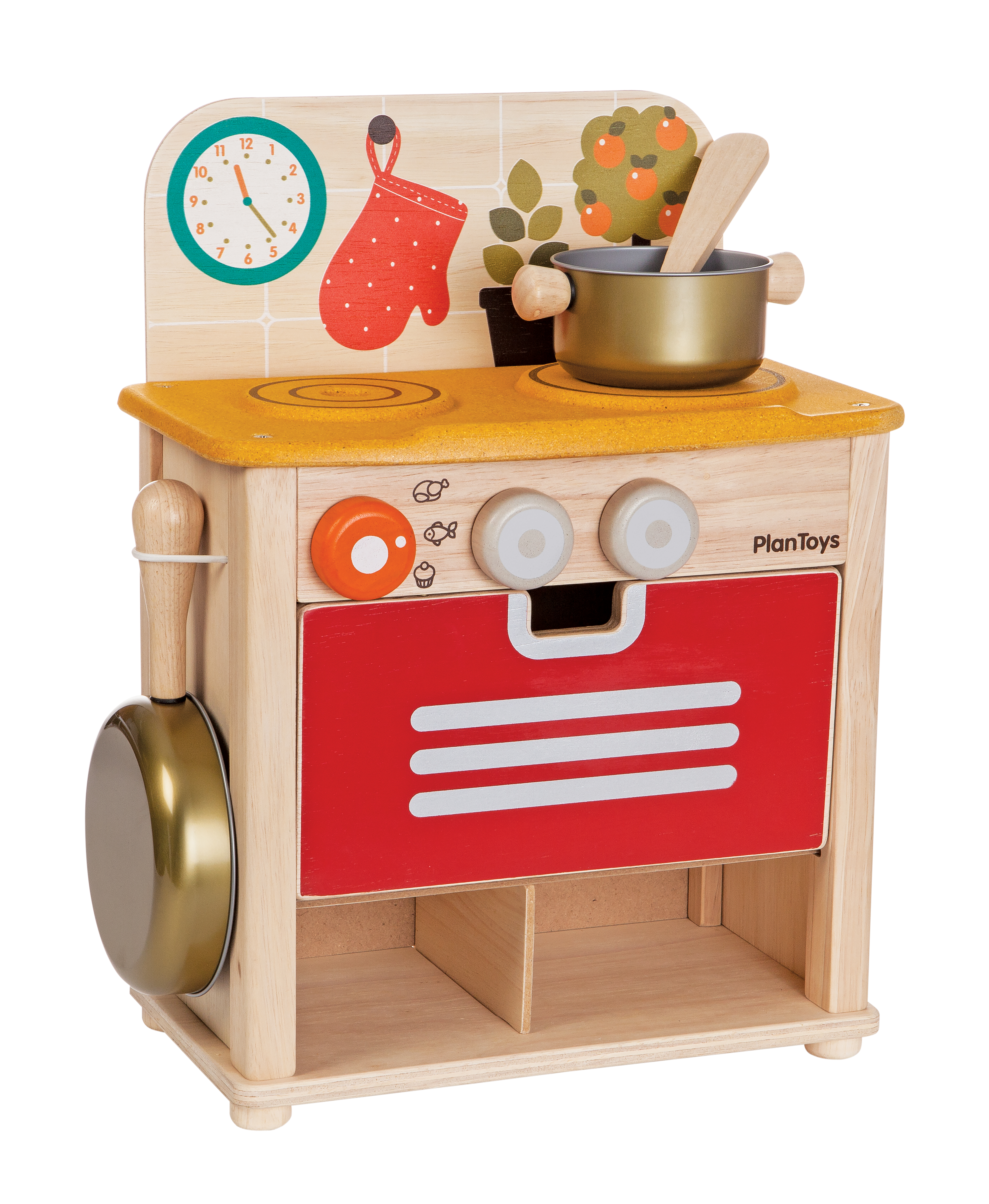 Includes a stove top with turning knobs that make a click clack sound when turned, an oven, frying pan, pot and spatula