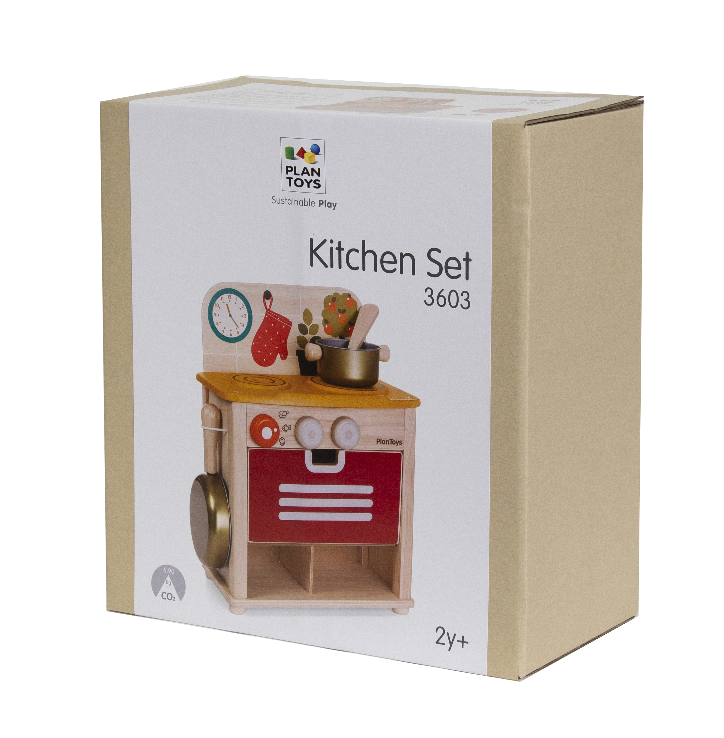 This realistic Kitchen Set includes a stove top with turning knobs that make a click clack sound when turned, an oven, frying pan, pot and spatula. This item is easily transported and can be played with anywhere!