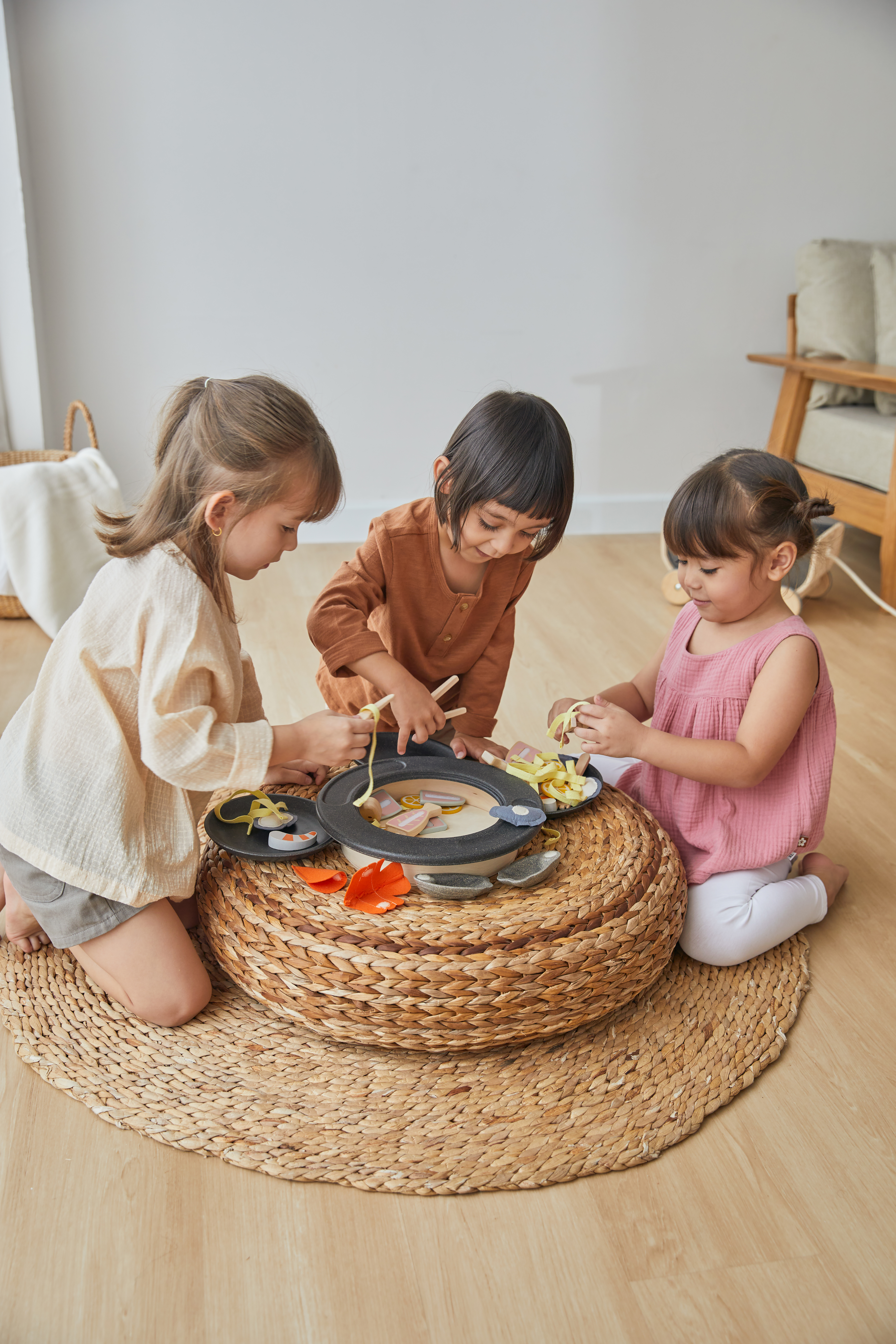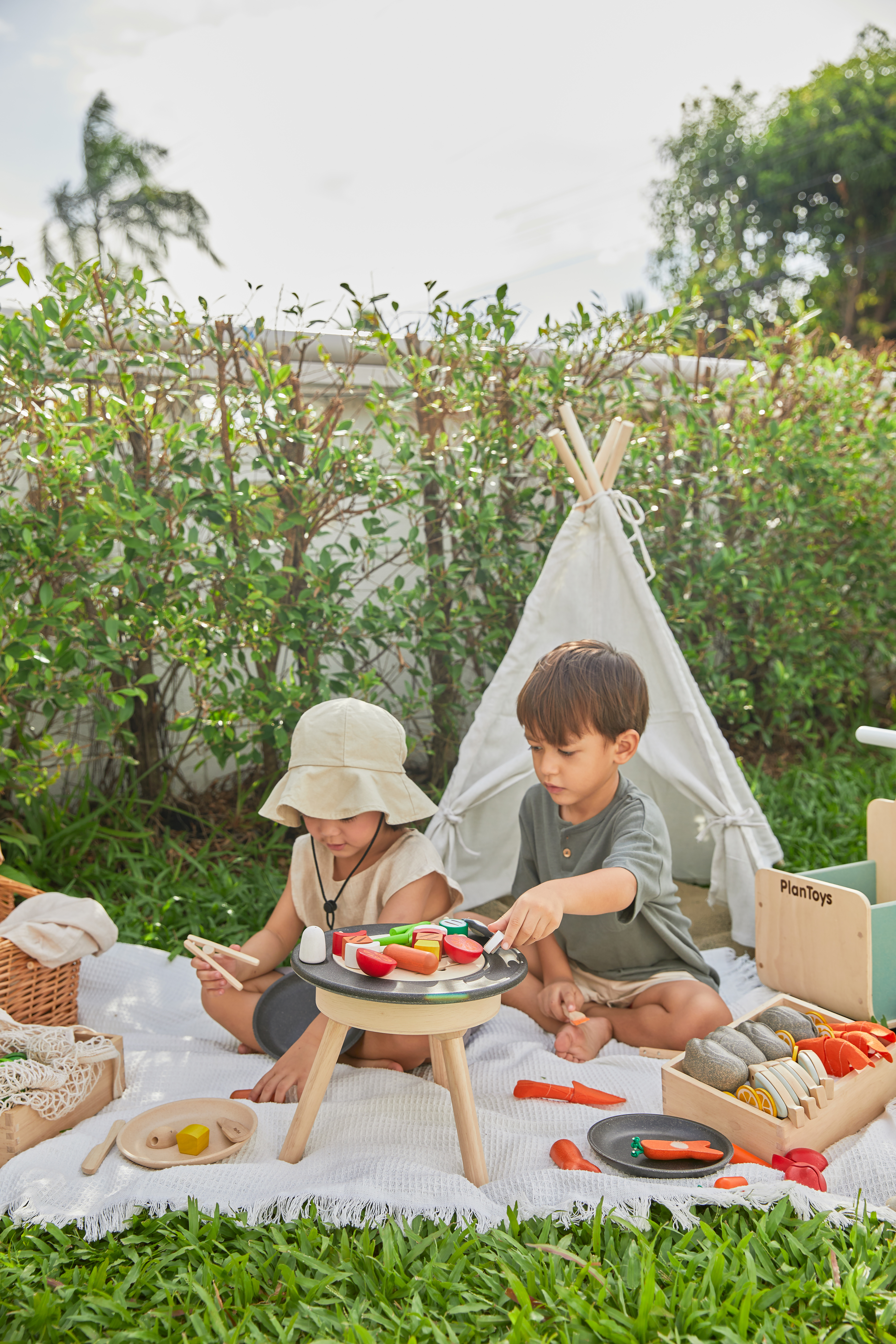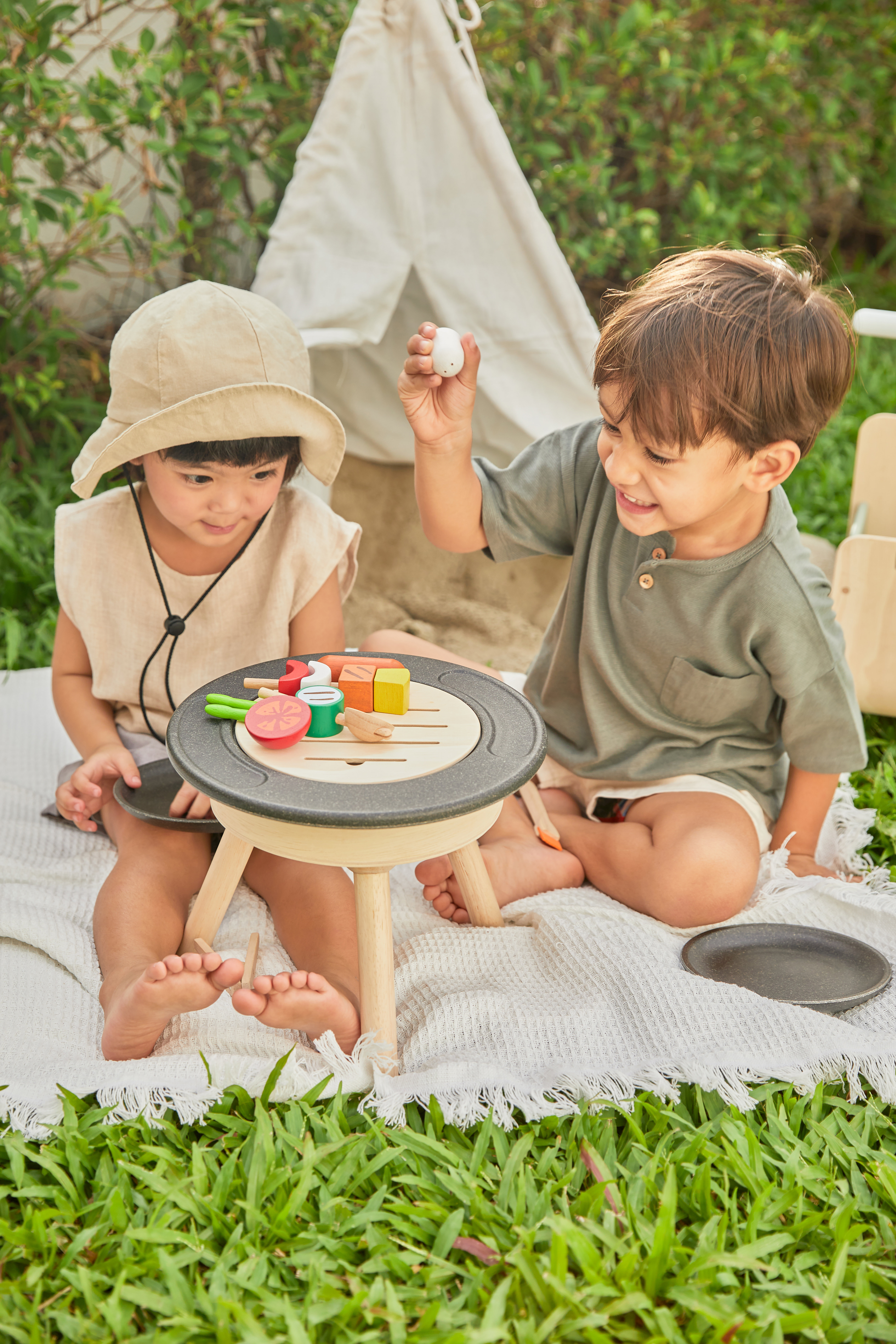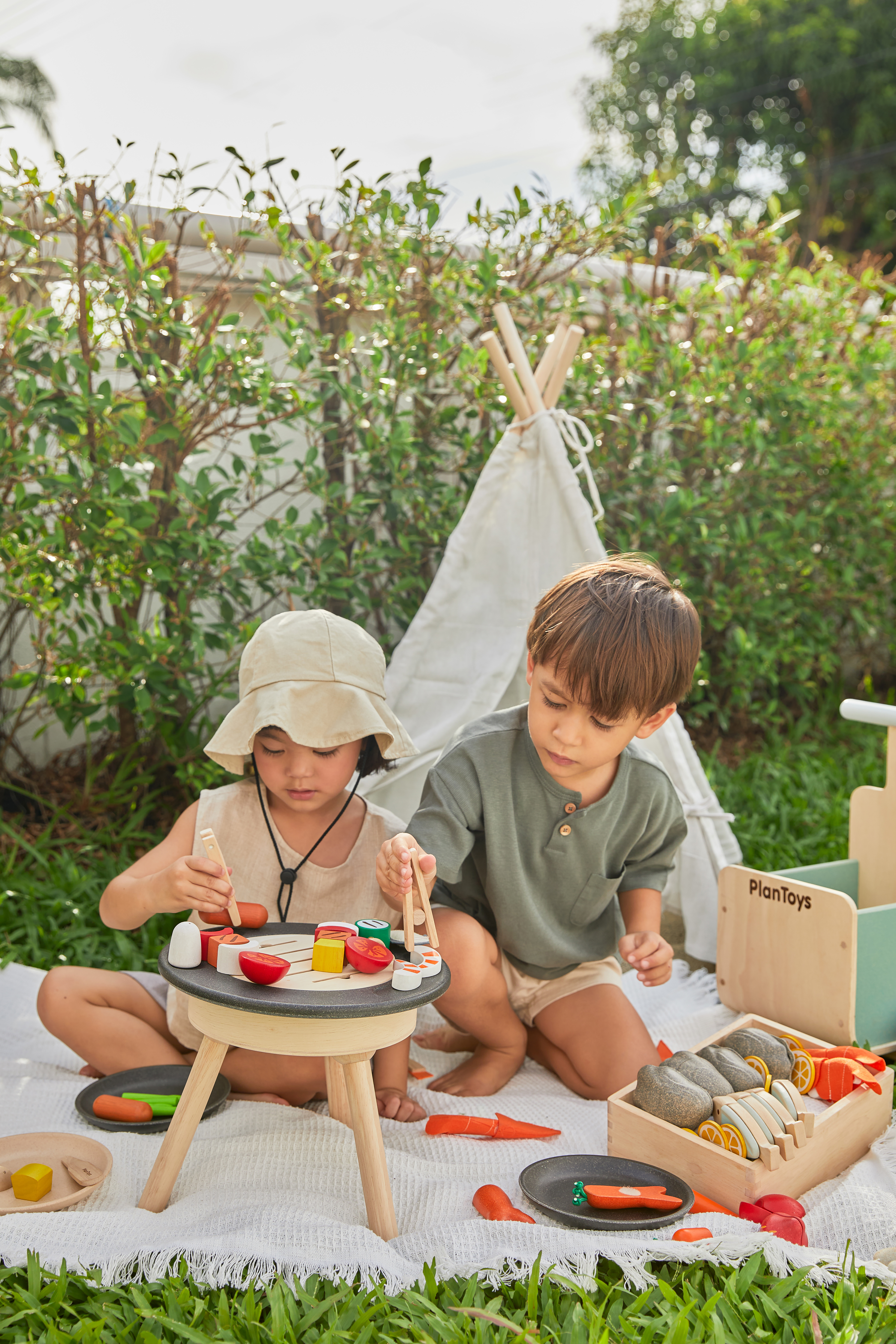 Gather around, and let’s barbecue! This set will boost a young chef’s imagination and social skills by preparing a meal with friends and family nearby. Children will also develop fine motor skills as they cook with fully functioning tools. This set includes 1 tong, 1 sauce brush, 1 pepper bottle, 2 skewers, 1 sausage, 2 stalks of asparagus, 1 halved tomato, 1 grilled beef wedge, 1 pineapple wedge, 1 onion, 1 mushroom, 1 zucchini, 1 bell pepper, 1 plate, 3 pieces of charcoal, 1 flame, and 1 stove with a removable lid. Remove the stove’s legs for a social dining experience. Combine this set with other PlanToys pretend foods and kitchenware to keep guests coming back for more!