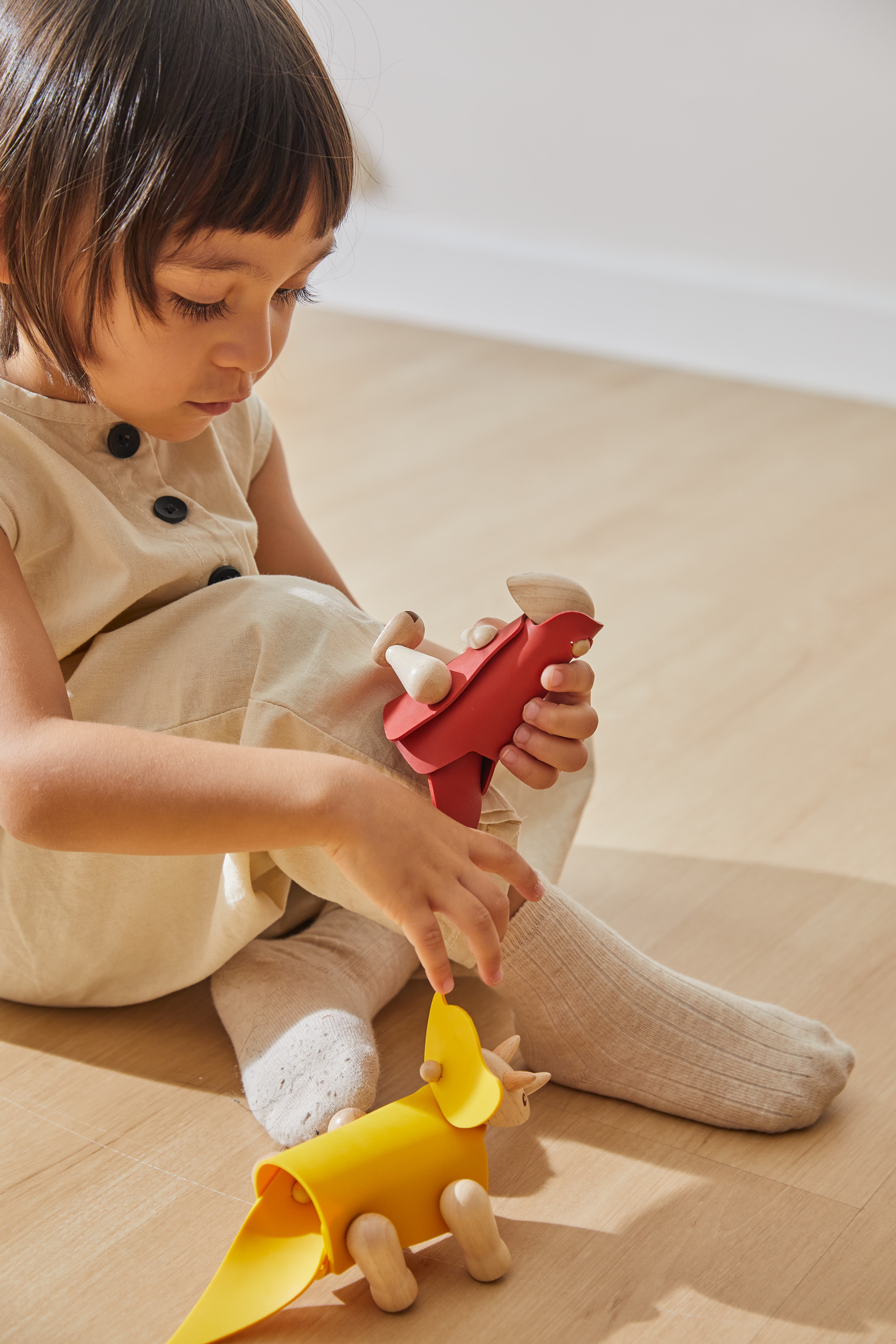 Be on the lookout for big footprints! This Tyrannosaurus, also known as a theropod, can transform into a three-dimensional form by combining a variety of different parts, both rubber, and wood. Take the transformation even further by adding materials of your choice with a dash of imagination. An infographic flashcard is included to combine learning with play.