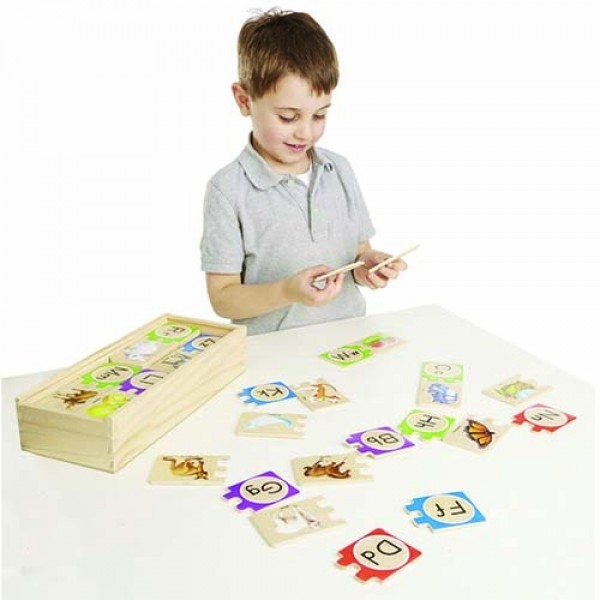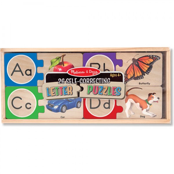 Learn to recognise upper-case and lower-case letters with this wooden puzzle from Melissa & Doug. The puzzles are self-correcting which means each piece has only one match that fits so children can play independently and learn at the same time. Pieces fit neatly in sturdy storage box with slide-lid.