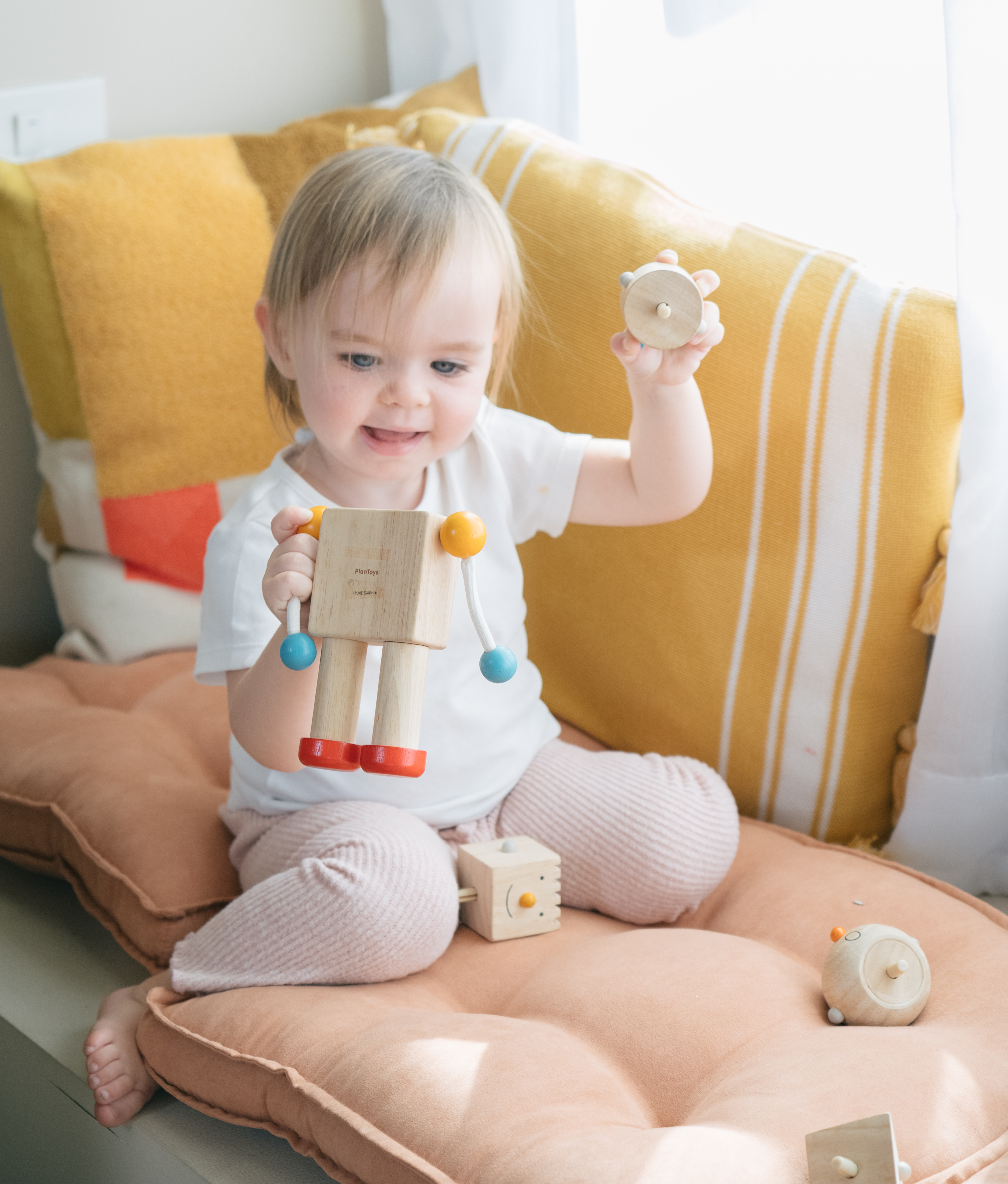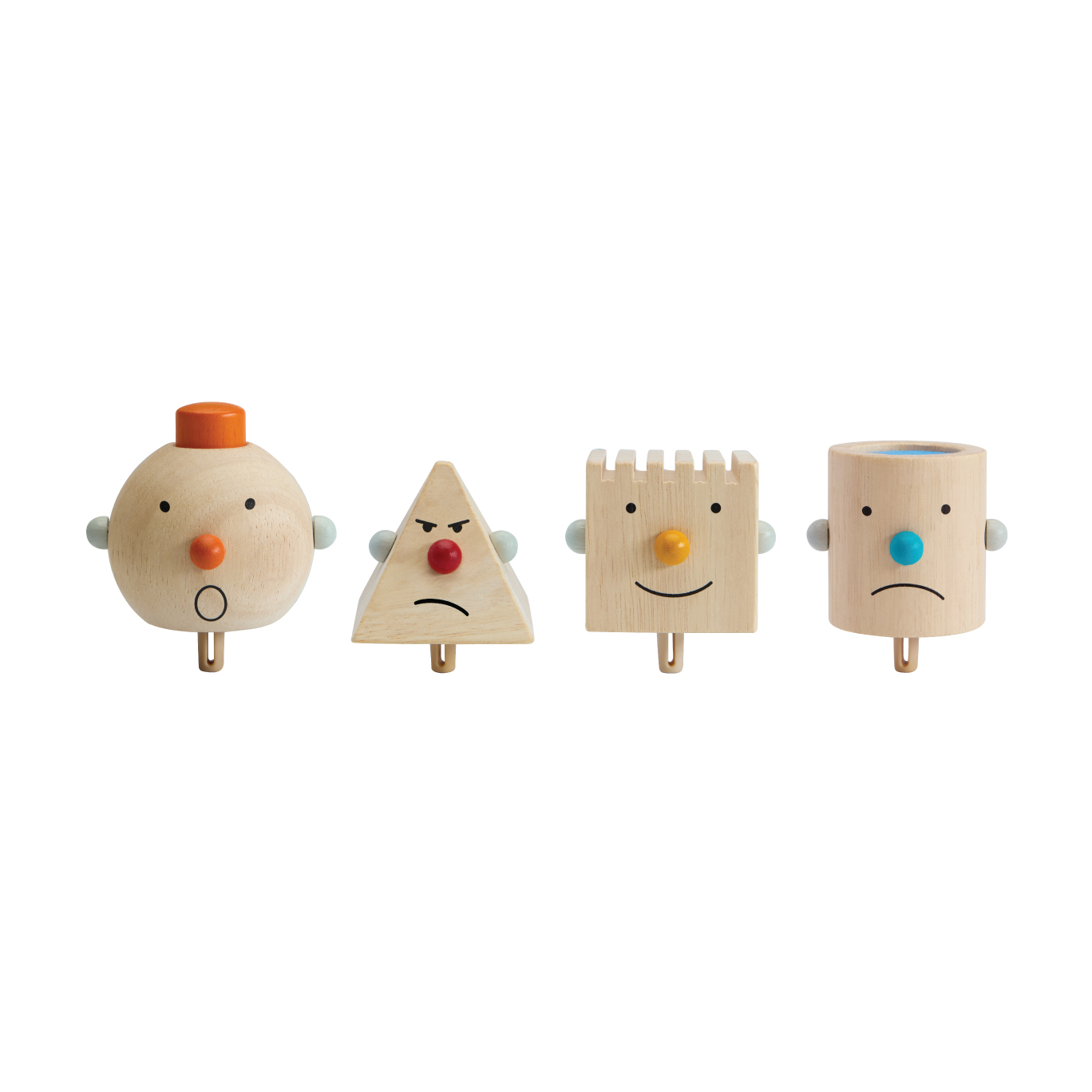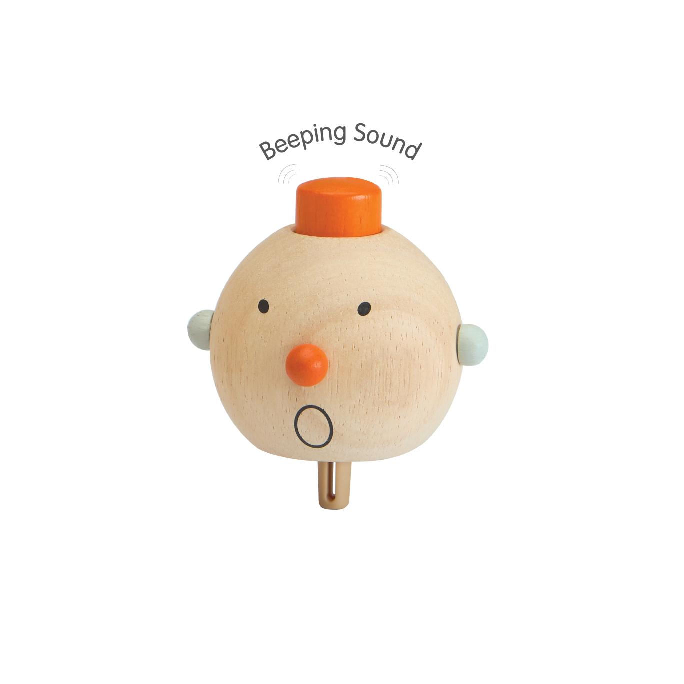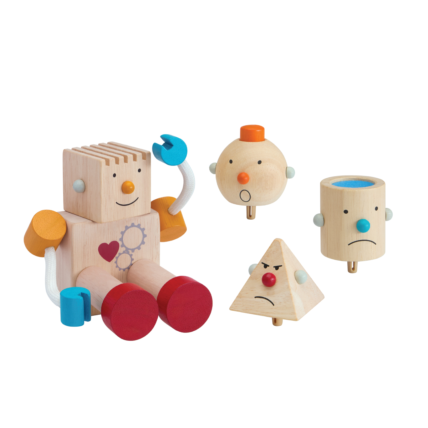 This charming robot features four interchangeable heads, which teach emotions and offer different tactile & auditory experiences. Legs are movable for standing or sitting.