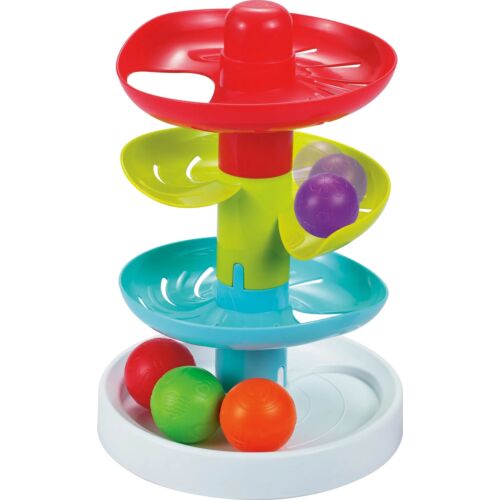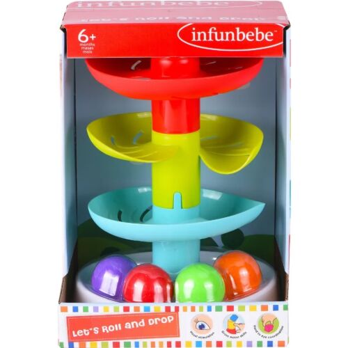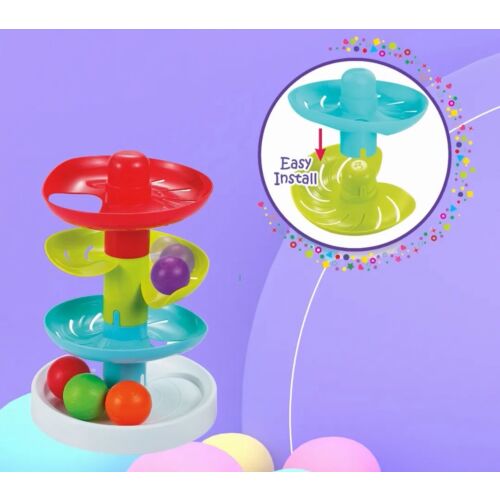 Infunbebe | Let's Roll and Drop 4-tiered sloping tower with colourful rolling balls. This playset includes 4 colourful balls and 4 take-apart tiers. Featuring 3 different level of slopes, resulting in varied rolling speeds as the balls roll through each slope level. The rolling pattern of the balls can be modified by modifiying the arrangement of the sloping tiers.