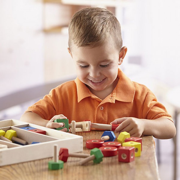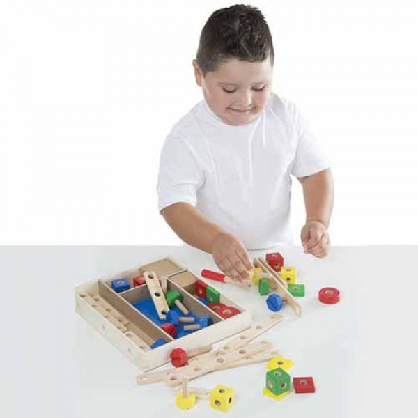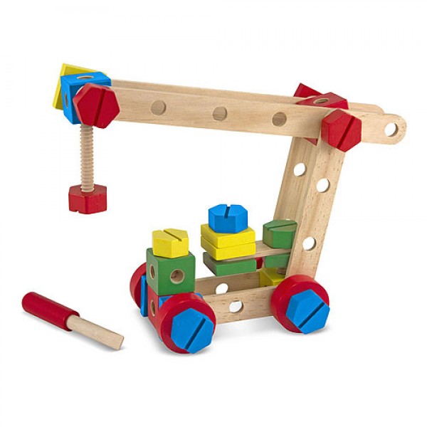 With 48 wooden pieces (including nuts, bolts, drilled bars to connect, and a child-size screwdriver), this classic building set gives kids all they need to tinker and build! Printed right on the sturdy storage box are building plans for a crane, motorcycle, airplane, and race car to get the fun started. With some imagination and a few creative twists and turns, kids can make hundreds more amazing structures too! Any time kids play with this durable set, they'll be building fine motor skills, problem-solving skills, and hand-eye coordination. Included extension activities guide parents to educational activities that also build early math skills.