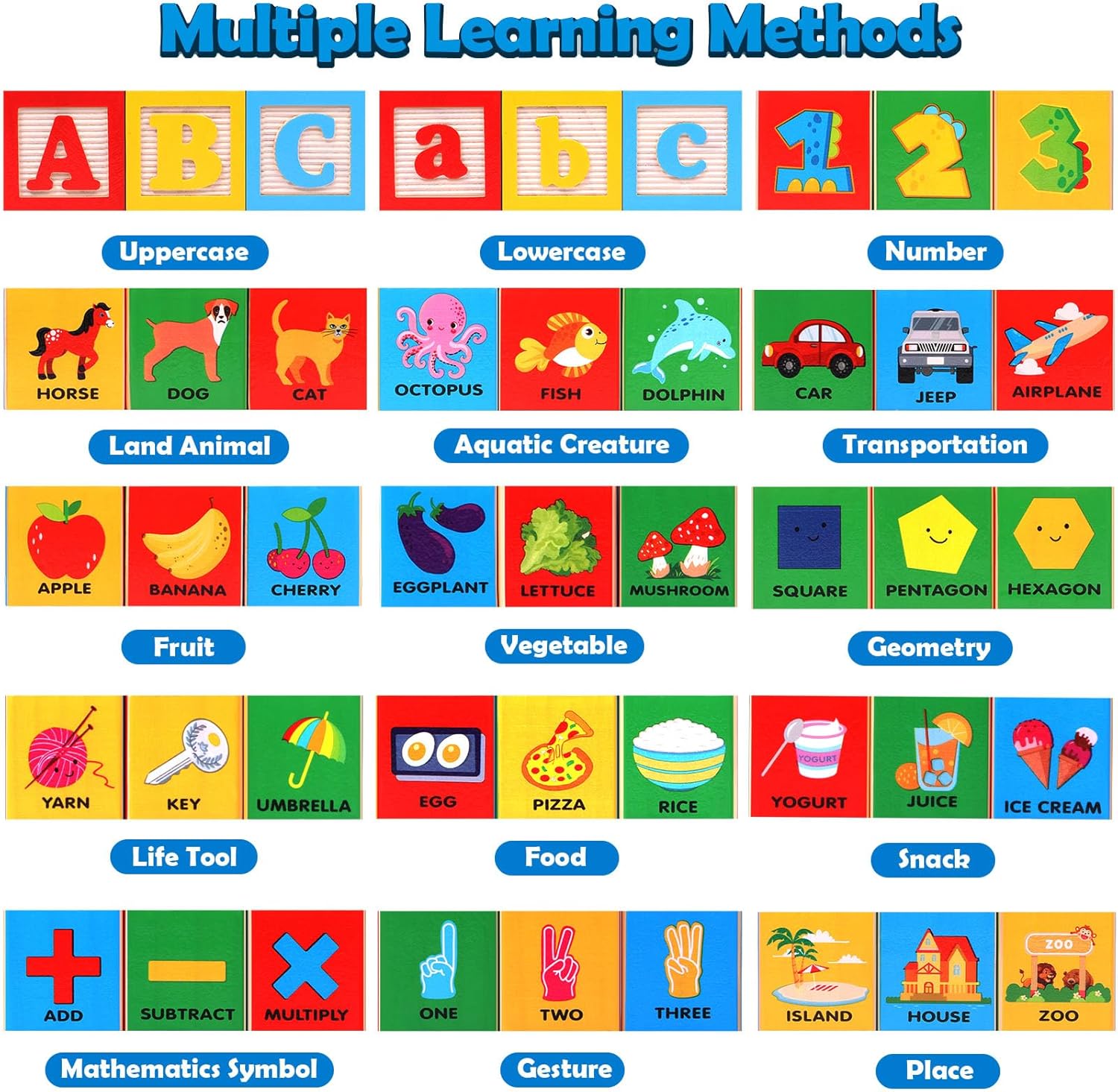 Each block side with colorful design including 180 pcs alphabet uppercase, lowercase, numbers, shapes, animals, fruits, vegetables etc. Wooden push & pull toy wagon is easy for kids to drag, carry and store the blocks in an organized way.