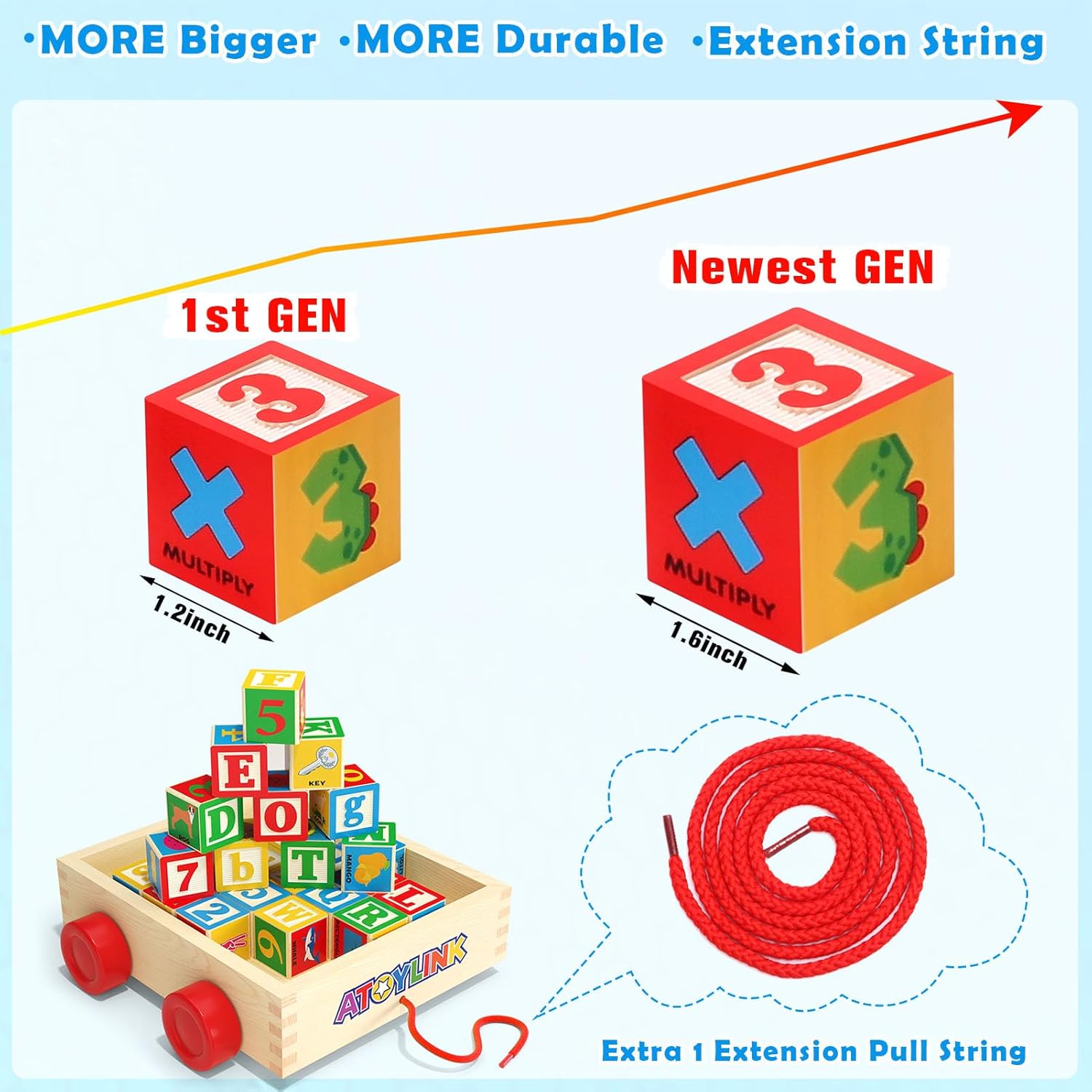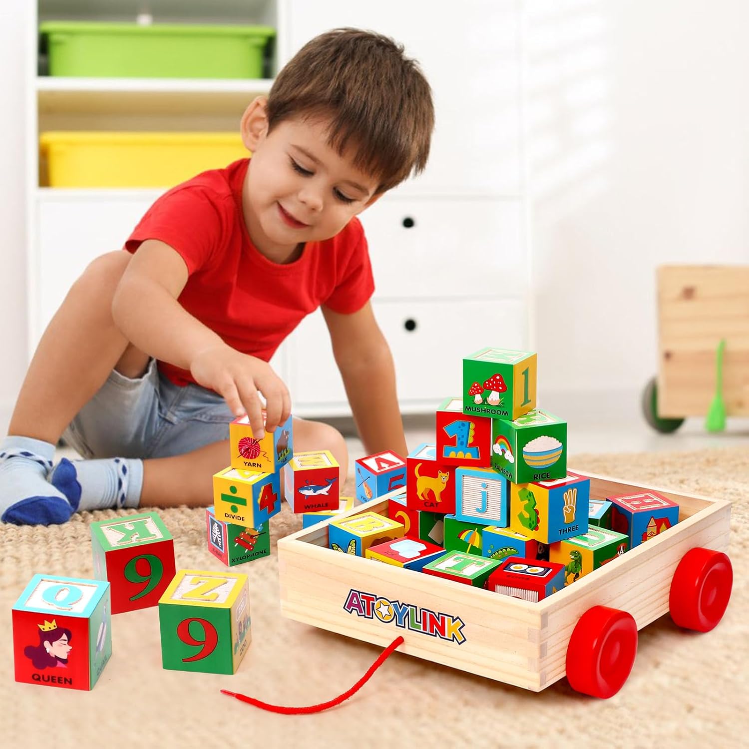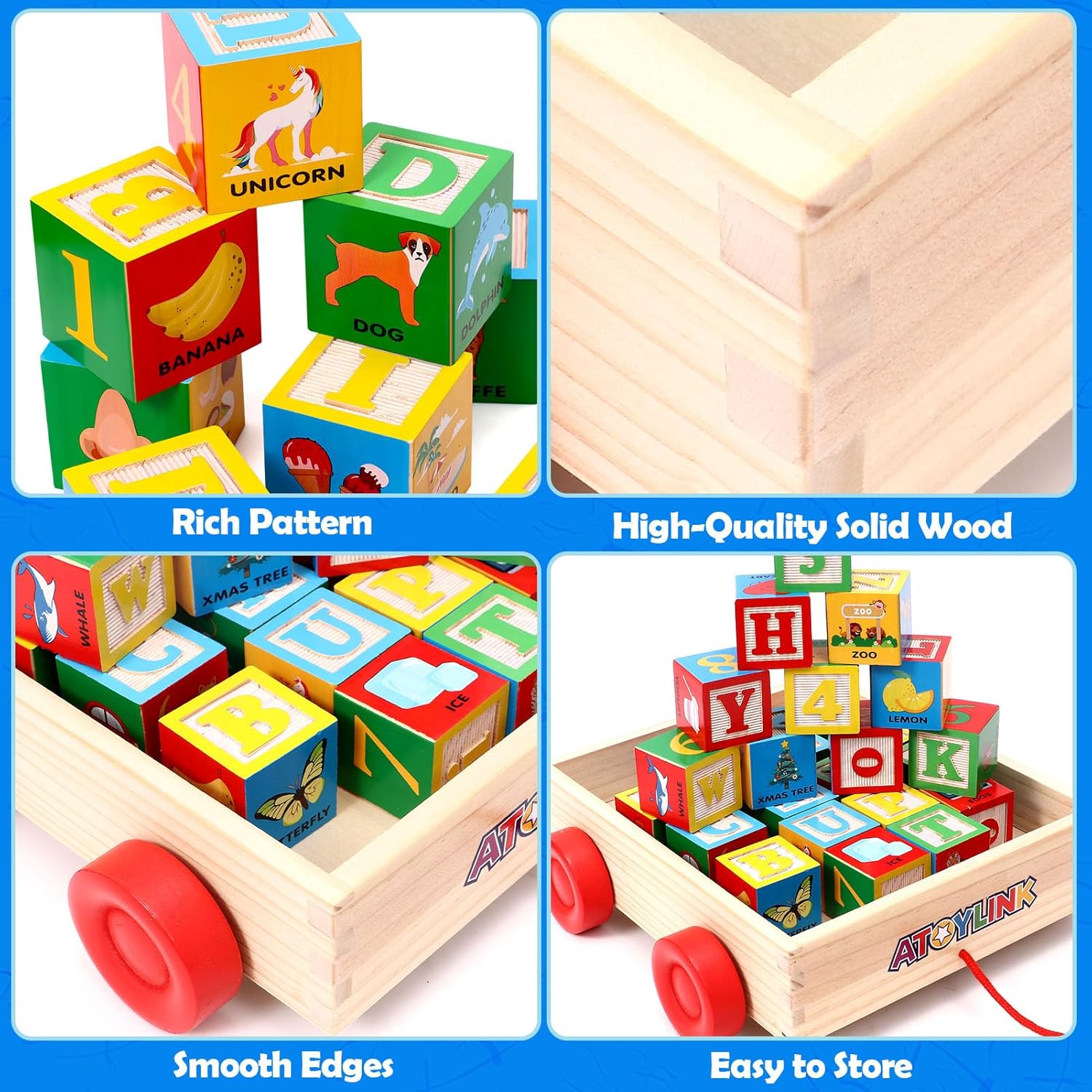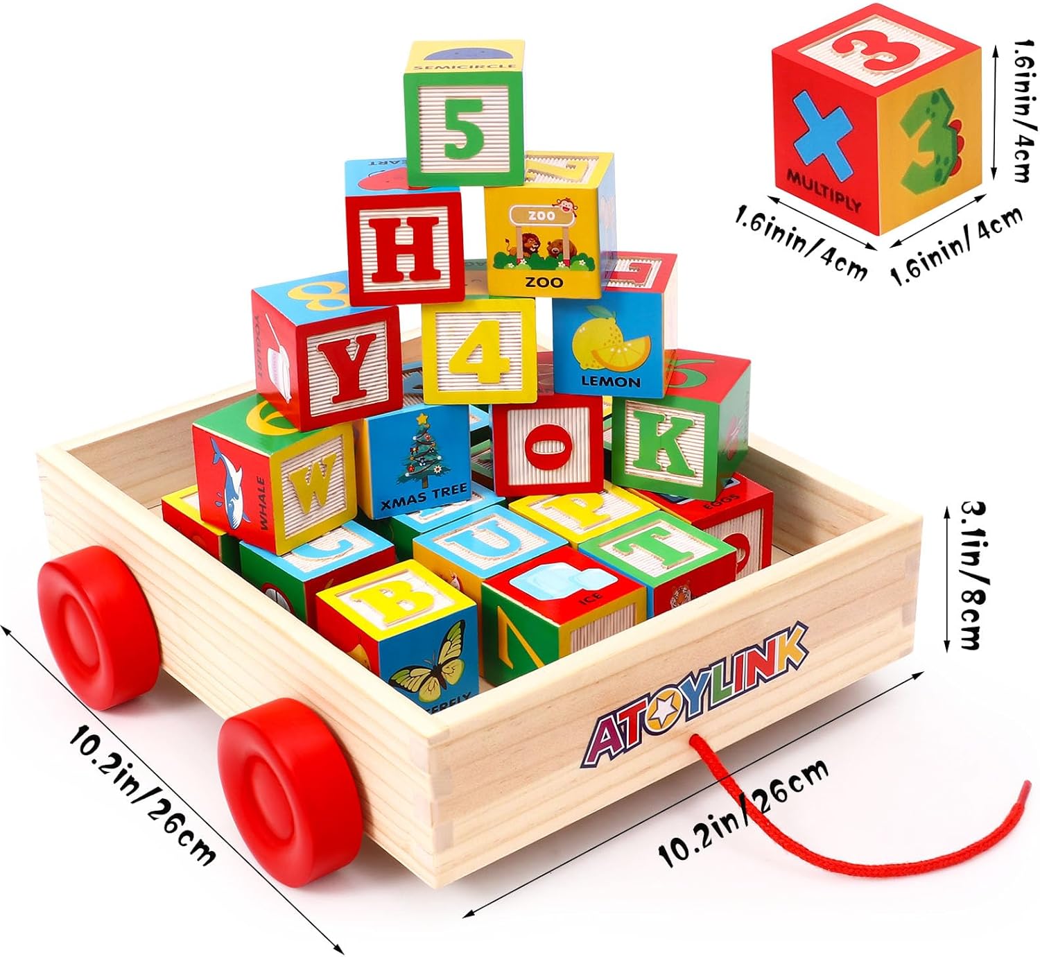 AtoyLink - 30PCS WOODEN ABC BUILDING BLOCKS ALPHABET & NUMBER X-LARGE STACKING TOYS WITH STORAGE PULL TOY CAR