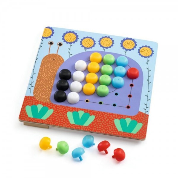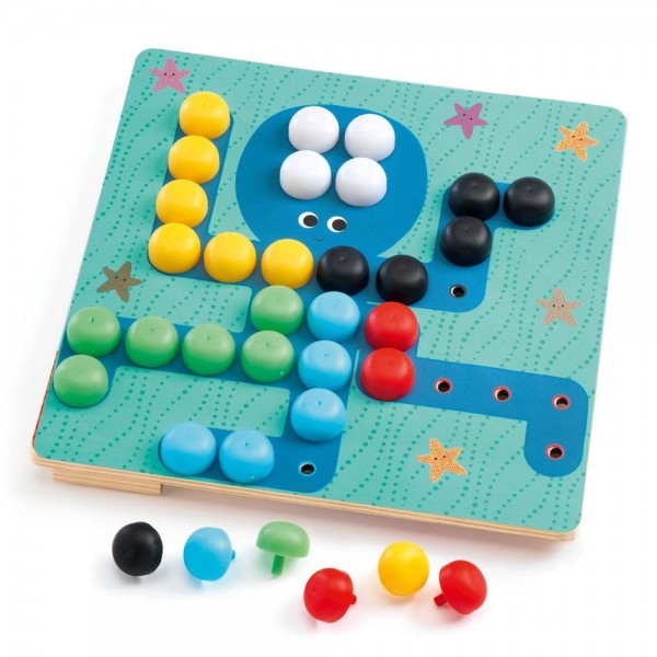 The game contains 120 coloured pegs, 8 picture cards and 1 wooden board.