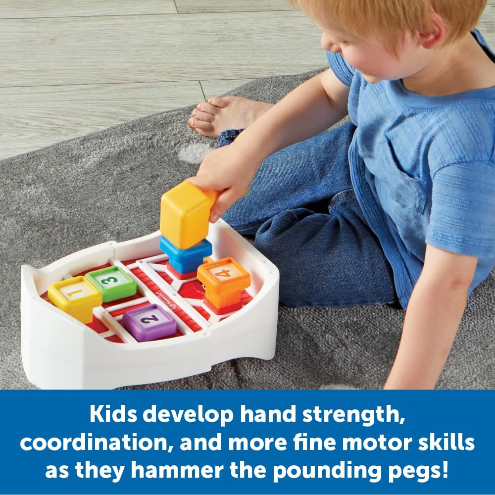 Two Themes in One ! This preschool learning toy’s double-sided bench comes with two fun themes—count numbers 1-5 on one side, and discover farm-fresh foods on the other ! Equipped with toddler toy’s kid-safe plastic hammer, kids can knock the barn’s five colorful blocks into place, then flip the barn and do it again!