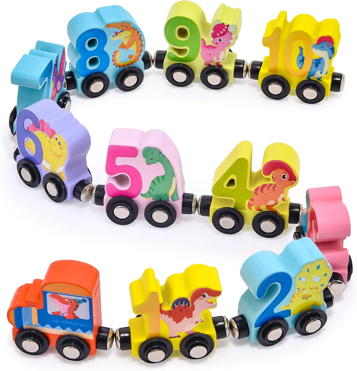AtoyLink - 11PCS WOODEN DINOSAURS TRAIN SET MAGNETIC NUMBER TRAIN TOYS ENGINE TRAIN CARS